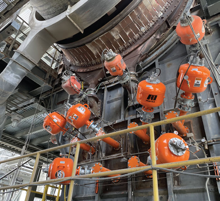 In the preheater, air cannons dislodge buildup from the walls of riser ducts, feed pipes and other locations to avoid clogging and promote the free flow of material. Before their widespread adoption, when operators detected a flow bottleneck, production would be halted and the process shut down for manual cleaning, typically by workers in high heat PPE using air lances, widely considered one of the least desirable tasks on the plant.
